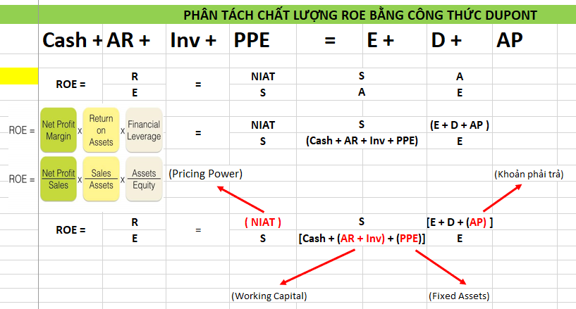 + Phân tách chất lượng ROE bằng công thức Dupont: