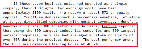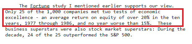 Đặc biệt là trong bức thư năm 1987, sau khi nói về 7 doanh nghiệp con mà Berkshire Hathaway đang sở hữu ( Buffalo News, Fechheimer, Kirby, Nebraska Furniture Mart, Scott Fetzer Manufacturing Group, See's Candies, and World Book ) đã đạt ROE liên tục trên 50%, Buffett nói rằng trong danh sách Fortune 1000 năm 1988, chỉ có 06 doanh nghiệp có thể đạt ROE trên 30% suốt 10 năm qua, và chỉ có 25 doanh nghiệp đạt ROE trung bình trên 20% suốt 10 năm qua và không có năm nào dưới 15% - " In its 1988 Investor's Guide issue, Fortune reported that among the 500 largest industrial companies and 500 largest service companies, only six had averaged a return on equity of over 30% during the previous decade. The best performer among the 1000 was Commerce Clearing House at 40.2% [...] The Fortune study I mentioned earlier supports our view. Only 25 of the 1,000 companies met two tests of economic excellence - an average return on equity of over 20% in the ten years, 1977 through 1986, and no year worse than 15%."
