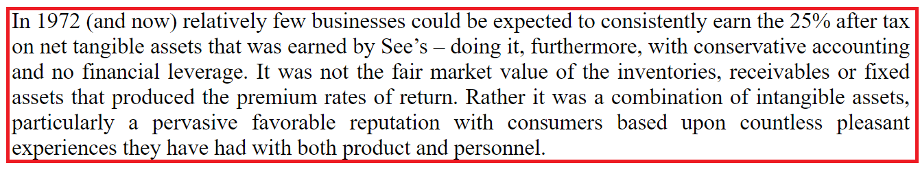 Trong thư năm 1983, sau khi mua và vận hành See Candy nhiều năm, Buffett nói rằng đây là doanh nghiệp tuyệt vời vì thỏa (X) liên tục nhiều năm, và Buffett còn đảm bảo rằng không có nhiều doanh nghiệp ở Mỹ pass qua được bài test đơn giản này, hiện tại ở VN cũng không có nhiều doanh nghiệp thỏa bài test RONTA 25% liên tục nhiều năm này - " Vào năm 1972 ( và cho đến bây giờ ), chỉ có tương đối ít doanh nghiệp thỏa kỳ vọng kiếm được 25% lợi nhuận sau thuế trên tổng tài sản hữu hình ròng (RONTA = 25%) như See's làm được, hơn nữa, phải với một chính sách kế toán thận trọng và không dùng đòn bẩy - In 1972 (and now) relatively few businesses could be expected to consistently earn the 25% after tax on net tangible assets that was earned by See’s doing it, furthermore, with conservative accounting and no financial leverage "