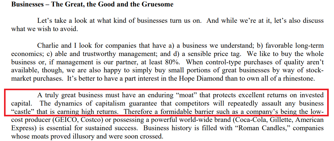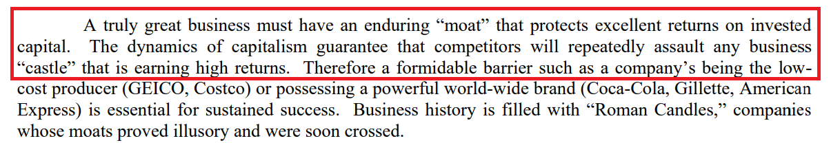 Trong bức thư năm 2007, Buffett nhấn mạnh " Một doanh nghiệp thực sự tuyệt vời phải có một "Con hào kinh tế Moat" bền vững để bảo vệ tỷ suất lợi nhuận cao tuyệt vời trên vốn đầu tư mà doanh nghiệp đang sở hữu. Động lực của chủ nghĩa tư bản đảm bảo rằng các đối thủ cạnh tranh sẽ liên tục tấn công bất kỳ "Lâu đài kinh doanh" nào đang kiếm được tỷ suất lợi nhuận cao - A truly great business must have an enduring “moat” that protects excellent returns on invested capital. The dynamics of capitalism guarantee that competitors will repeatedly assault any business “castle” that is earning high returns.