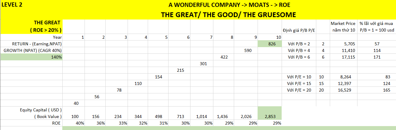 The Great - Loại Tuyệt Vời ( See's Candy ): Loại mô hình kinh doanh có thể tạo ra mức tỷ suất sinh lợi cao trên vốn chủ đầu tư, tức ROIC cao, lợi nhuận sau thuế tự tăng trưởng (additional earnings) qua các năm mà không cần thêm vốn mới (no additional capital) rót vào để tăng trưởng hoặc rót thêm rất ít, tỷ suất sinh lợi ROIC cao hơn qua các năm.