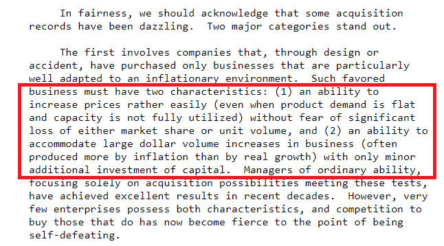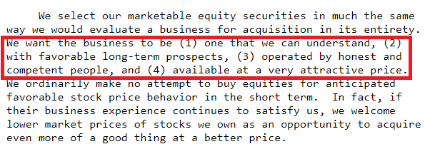 Từ năm 1977, và xuyên suốt 40 năm về sau này, Buffett vẫn luôn ghi trong thư gửi cổ đông là ông muốn tìm một một doanh nghiệp có 04 đặc điểm sau:
