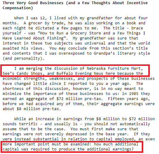 Thông qua thư gửi 1985, Buffett đưa ra ví dụ về 03 doanh nghiệp Nebraska Furniture, See's Candy Shops, và Buffalo Evening News, ông nhắc đi nhắc lại rằng, không có nhiều doanh nghiệp sở hữu những đặc tính kinh tế này, tức là không có nhiều doanh nghiệp có khả năng tăng thêm gấp đôi lợi nhuận (Additional Earnings) mà lại không yêu cầu bơm thêm vốn đầu tư mới (Additional Capital) gấp đôi tương ứng. Trong 15 năm, 3 doanh nghiệp này đã tăng lợi nhuận trước thuế từ 8 mil USD lên 72 mil USD ( tức tăng thêm 64 mil USD), mà chỉ cần thêm có 40 mil USD vốn mới rót vào, tức tạm nhẩm tính ROE = 64/40 = 160%.