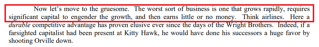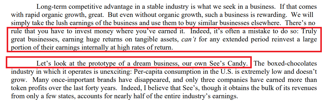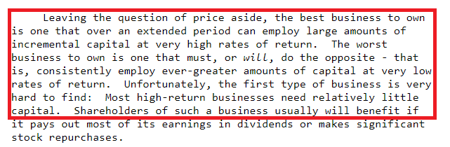Lần khác, trong thư gửi cổ đông năm 1992, Buffett có viết " The best business to own is one that over an extended period can employ large amounts of incremental capital at very high rates of return - Xét trong khoảng thời gian dài, business tốt nhất là business có thể sử dụng một lượng vốn lớn gia tăng với tỉ suất lợi nhuận trên vốn cao "