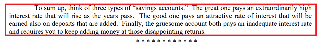 Buffett tổng kết: " To sum up, think of three types of “savings accounts.” The great one pays an extraordinarily high interest rate that will rise as the years pass. The good one pays an attractive rate of interest that will be earned also on deposits that are added. Finally, the gruesome account both pays an inadequate interest rate and requires you to keep adding money at those disappointing returns."