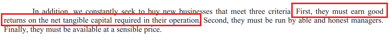 Trong thư năm 2019, Buffett cũng nhấn mạnh là Berkshire Hathaway muốn mua một doanh nghiệp mà "phải (must) kiếm được Returns cao trên tài sản hữu hình ròng cần để vận hành doanh nghiệp - First, they must earn good returns on the net tangible capital required in their operation"