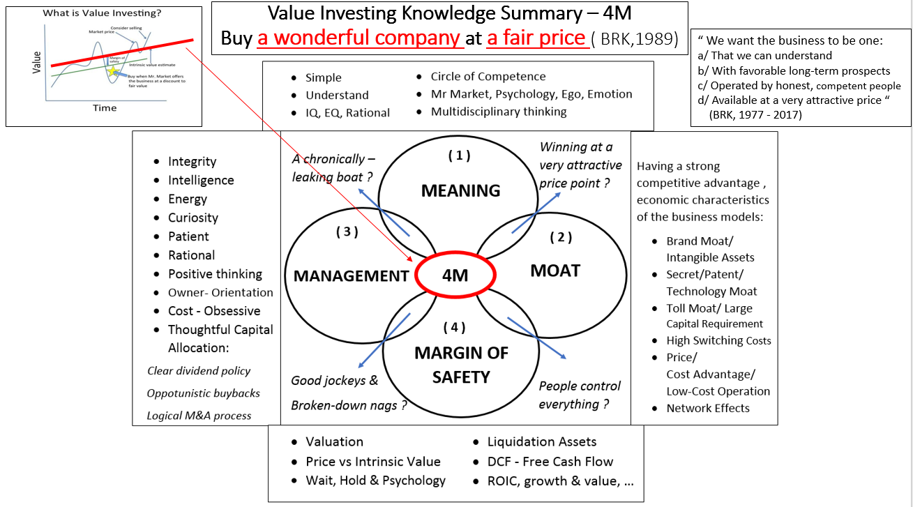 ( Chúng tôi nghĩ sau này Phil Town trong sách Payback Time tiếng Việt do Happy Live dịch đã tóm gọn 4 đặc điểm này thành triết lý 4M khá dễ hiểu và dễ nhớ: MEANING Simply Understand, MOATS, MANAGEMENT, MARGIN OF SAFETY ). Từ các bài viết sau này, chúng tôi sẽ dùng ký hiệu 4M để diễn giải cho quý độc giả dễ hiểu )