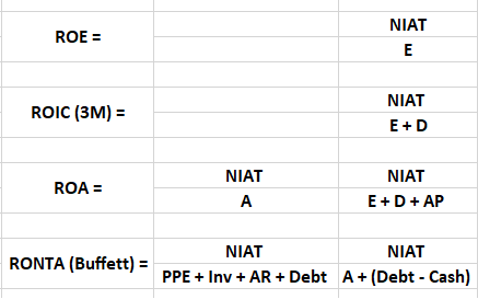 Và đương nhiên, nếu chỉ số RONTA kiểu Buffett này (NIAT/(PPE + Inventory + AR + Debt)) thỏa > 25%, thì các chỉ số ROE (Net Income/Equity) hoặc ROIC (Net Income/(Equity + Debt) ) hoặc ROA (Net Income/ Total Asset) cũng sẽ thỏa > 25% tương ứng. Theo chúng tôi đánh giá, trong 4 chỉ số ROE ROIC ROA RONTA thì chỉ số RONTA (kiểu Buffett) này khá khắt khe hơn các chỉ số kia, và có rất ít doanh nghiệp tại VN pass qua được bài test này