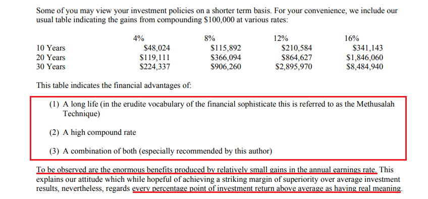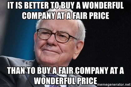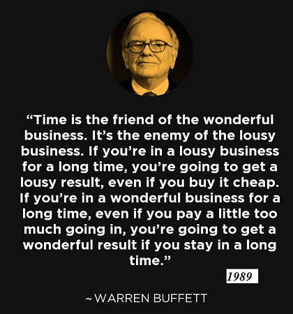 Trong thư gửi cổ đông năm 1989, Buffett viết " Time is the friend of the wonderful business, it's the enemy of the lousy business. If you are in a lousy business for a long time, you are going to get a lousy result, even if you buy it cheap. If you are in a wonderful business for a long time, even if you pay a little too much going in, you are going to get a wonderful result if you stay in a long time - Thời gian là bạn của những business tuyệt vời, và là kẻ thù của những business tệ hại. Nếu bạn đang âu yếm một business tệ hại, sớm muộn gì bạn cũng sẽ có kết quả tệ hại, dù cho ban đầu bạn mua nó với giá rẻ. Nếu bạn đang âu yếm một business tuyệt vời, miễn là ở với nó đủ lâu, bạn sẽ có kết quả tuyệt vời, cho dù ban đầu bạn trả một giá mua hơi mắc một tí "