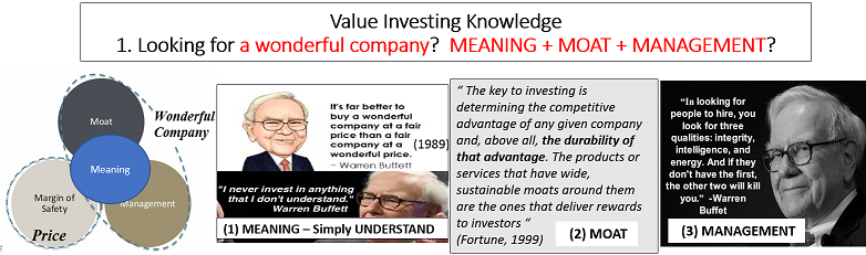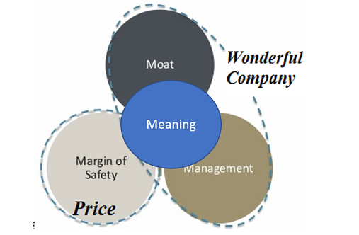 Dựa trên triết lý của Warren Buffett về một doanh nghiệp tuyệt vời, tìm những doanh nghiệp theo phương pháp 4M có MEANING Can Simply Understand + MOAT + MANAGEMENT để đảm bảo Giá trị nội tại Intrinsic Value tăng dần theo thời gian.
