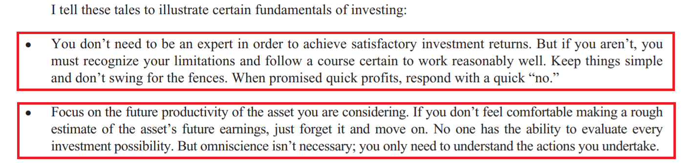 Trong thư gửi cổ đông năm 2013, Buffett dạy rằng không ai có khả năng định giá trị tất cả các doanh nghiệp cả, cho nên chúng ta chỉ tập trung ước lượng dòng tiền tự do FCF của những doanh nghiệp mà chúng ta hiểu rõ và dễ ước lượng dòng tiền, nếu gặp những doanh nghiệp chúng ta không hiểu và khó ước lượng dòng tiền, cách đơn giản là hãy quên nó đi và bước tiếp ( JUST FORGET IT and MOVE ON )
