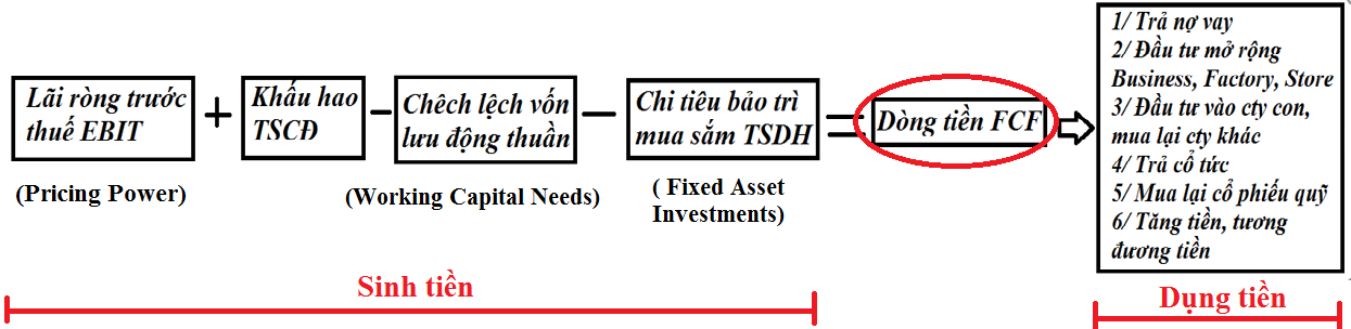 Dòng tiền tự do (Free Cash Flow FCF) là mục đích cuối cùng của một business, là cái mà một người chủ (cổ đông) quan tâm nhất khi nhìn vào doanh nghiệp. Quá trình từ Doanh thu -> Lợi nhuận sau thuế -> Free Cash Flow gọi là quá trình SINH TIỀN, quá trình từ Free Cash Flow đi làm các việc khác gọi là quá trình DỤNG TIỀN, có 06 việc cơ bản thường làm trong quá trình DỤNG TIỀN là :