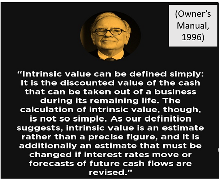 Trong thư hướng dẫn những nhà đầu tư định mua cổ phiếu BRK và sẽ trở thành chủ sở hữu của Berkshire Hathaway (BRK, Owner's Manual,1996 ), Warren Buffett có đưa ra định nghĩa về Intrinsic Value của một doanh nghiệp hay một tài sản bất kỳ như sau: " Intrinsic Value can be defined simply: It is discounted value of the cash that can be taken out of the business during it's remaining life - ( tạm dịch ) Giá Trị Nội Tại có thể được định nghĩa đơn giản: Đó là giá trị chiết khấu của các dòng tiền mặt được rút ra khỏi doanh nghiệp trong suốt vòng đời hoạt động còn lại của nó ". "The cash" mà Buffett nhắc đến, gọi theo ngôn ngữ kế toán, đó chính là dòng tiền tự do Free Cash Flow rút ra từ báo cáo tài chính của doanh nghiệp