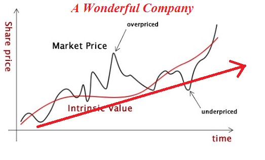 - Định giá trị ( Valuing/Valuation ) tìm vùng giá trị nội tại ( Intrinsic Value ) của A Wonderful Company và chỉ mua vào khi giá giao dịch Market Price dưới giá trị nội tại Intrinsic Value để đảm bảo có Biên An Toàn khi mua vào