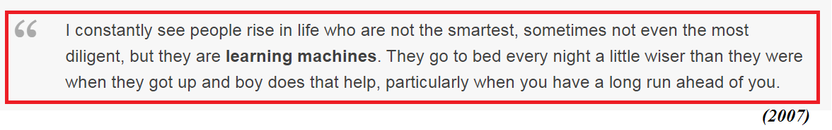 " Warren là một trong những cỗ máy học hỏi mạnh mẽ nhất trên quả địa cầu này. Những con rùa chạy nhanh hơn thỏ là những cỗ máy học hỏi. NẾU BẠN NGƯNG HỌC HỎI, THẾ GIỚI SẼ NGHIỀN NÁT BẠN - Warren is one of the best learning machines in this earth. The turtles who out run the hares are learning machines. If you stop learning in this world, the world rushes right by you. (Charlie Munger, USC Law School 2007) "